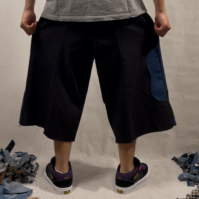 Ce Pantacourt, pièce unique, est fabriqué à la main à partir de vêtements invendus ou jetés. Grâce à l'upcycling, l'artiste NEEDLESS assure un look unique et artisanal.