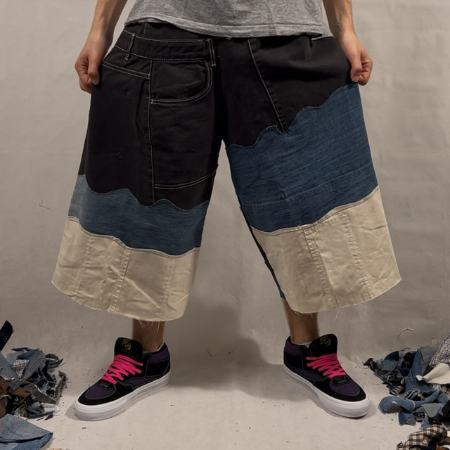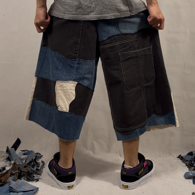 Ce Pantacourt, pièce unique, est fabriqué à la main à partir de vêtements invendus ou jetés. Grâce à l'upcycling, l'artiste NEEDLESS assure un look unique et artisanal.